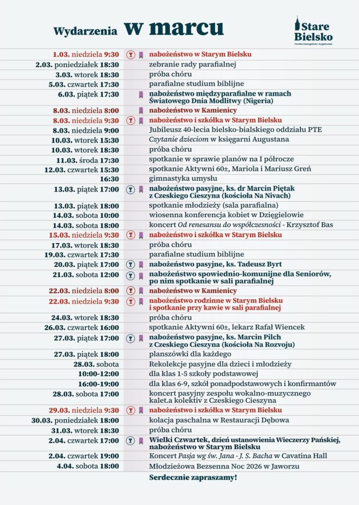 | 27.03.2026 Pt | 17.00 StB WP | Pasyjne Nabożeństwo tygodniowe ks. Marcin Pilch z Czeskiego Cieszyna |